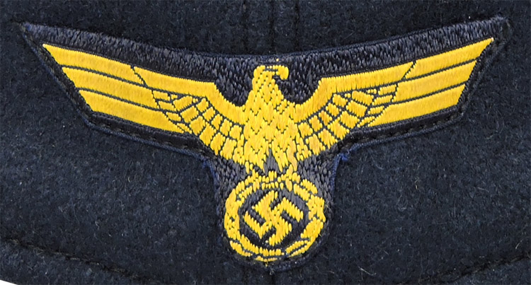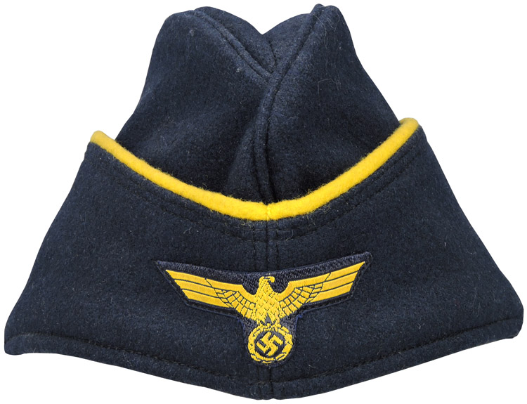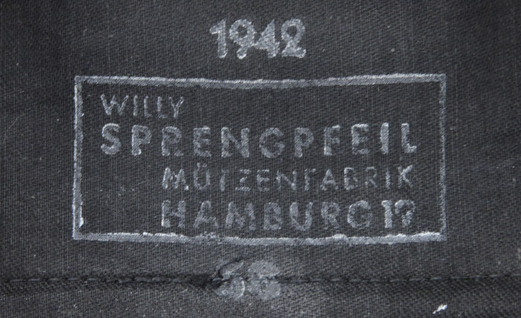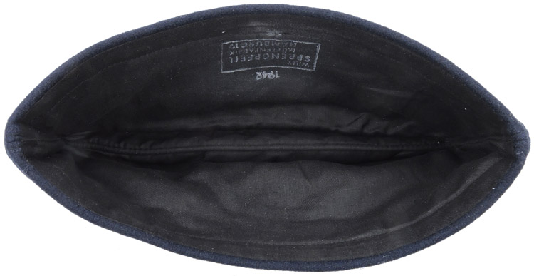 PHYSICAL DESCRIPTION: Nice quality, May 1944 pattern, deep navy blue wool/rayon blend construction cap features fold down side and back panels with gently sloping, downward scallops to the front and forward sides and golden yellow wool rank piping to the top edges. The fold down panels are handstitched in the upright position at the front center of the cap as is typical. The rank piping indicates the ranks of Marineunterführerin to Marineoberstabsführerin inclusively. The front center of the fold down panels has a machine woven national eagle in golden yellow threads on a woven, navy blue, rayon base. The eagle is machine stitched to the cap. The cap has no national tri-color cockade, as per regulations. The interior of the cap is fully lined in black rayon. Cap is maker marked to "Willy Sprengpfeil Mützenfabrik Hamburg 19", and the date, "1940". Size marked 58. Great cap!