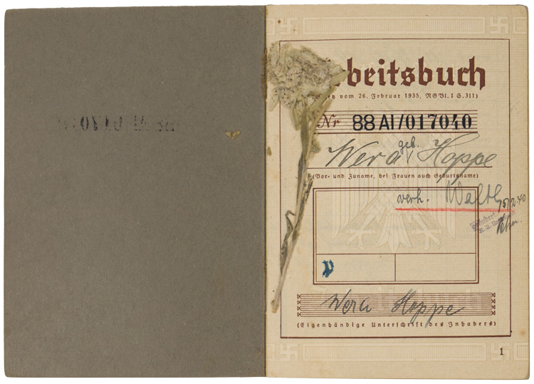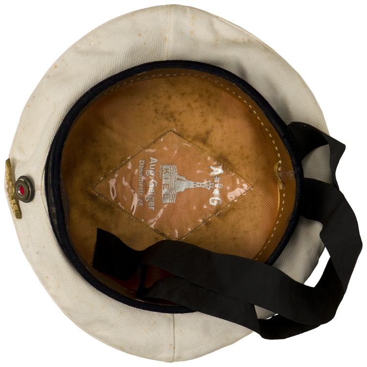 A fourteen-piece grouping, all from the estate of one Kriegsmarine veteran, consisting of his "Donald Duck" cap with two extra covers and a period photograph of him wearing it, a postcard from a military hospital, the employment record book of his wife, a book of poetry with National Socialist themes, an ancestry pass tracing his family lineage, a navy date book, a dark blue wool shirt and a field grey wool belt, sunglass lenses, a cotton sack, and a first world war era photograph of his father and mother. The German "Donald Duck" sailor’s cap ("Mannschaftsmütze" (Enlisted-cap), "Tuchmütze" (Cloth-cap), or "Dienstmütze" (Service-cap)) was based on traditional designs that date back to the creation of the Prussian Navy in 1848. The cap underwent numerous minor modifications during the intervening years, including the introduction of a cap with removable, interchangeable, white and blue covers in 1926. In 1931 a final pattern was established that remained in use until the end of WWII, with the only alterations then being to the insignia and cap tallies worn. The Weimar Reichswehr era oval cockade (in black, red and gold) was replaced with a new, circular cockade (in black, white, and red) in 1933. In 1934 the Kriegsmarine adopted a new national eagle on the front of the headgear and to the right breast of the uniform. 1936 regulations replaced the previously used gilt wire thread for the script on the cap tallies with golden yellow celleon threads, and in 1938 the "Kriegsmarine" titled cap tally was introduced for wear as a security measure in the case of mobilization; with the wear of named cap tallies restricted to barracks and on ships only if there was no possibility of them being seen by outside personnel. Additional regulations in mid-1940 withdrew all named cap tallies from further wear, to be replaced with the "Kriegsmarine" cap tally, for the duration of the war. The cap’s 11 1/2" diameter white canvas crown has the stitched outline of a name tag visible to its exterior center, and has 2 1/4" deep sides with seams to each of its cardinal points. The front center of the cap has fixed to it a stamped alloy, fire gilted national eagle, slightly convex and with a 2" wingspan, to which is connected a three-piece national tri-color cockade with a 7/8" diameter base. The eagle retains all of its fire gilting, with minor age dulling. The three-piece cockade consists of a black fluted base, and a silver-washed alloy roundel with a red felt dot to its center. Approximately 40% of the silver wash remains to the roundel. A 1 3/4" rifled vertical pin descends from the hollow back of the head of the eagle. Soldered to the hollow back of the wreathed swastika is a vertical tab with perforations which accepts the dual prongs to the back of the cockade. Stamped to this alloy tab is "D.R.G.M.," for "Deutsches Reichsgebrauchsmuster" (German Registered-design). The approximately 1 1/2" black headband has a 1 1/4" black silk cap tally with the machine woven Gothic script "Marineartillerieabteilung" (Marine-Artillery-Section), in gilt wire threads, to it. The horizontal cap tally has a vertical seam to its reverse to either side of which descend 16" vertical "tails" in the same width and of the same material as the tally. The ends of each of these "tails" are cut diagonally. The interior of the cap is fully lined in copper-colored rayon and features, to the center of its crown, a celluloid sweat diamond underneath of which is stamped, in silver, a light-buoy with "A" and "G" to either side of its light and "KIEL" to its base. "Ges. gesch." ("Gesetzlich geschützt;" protected by law) and the manufacturer’s name and address, "Aug. Geiger Dänischestr. 24," is beneath the image. The 1 3/4" brown leather sweatband has a white ribbon threaded through the numerous small vertical slashes above and along its edge and is tied to the reverse. An approximately 7 1/4" x 1/2" horizontal section of cork is beneath the sweatband to both the front and rear. The original wire stiffener may be seen along the interior circumference of the crown. Light age soiling is evident to the white cover, the inscription to the tally has lost its luster, one of its "tails" has two small holes to it, the interior crown is lightly soiled and has two small holes to it, and the interior sweatband has noticeable wear and soiling to it. Each of the cap’s two extra white canvas covers have approximately 11 1/2" diameter crowns and 2 1/4" deep sides with seams to each of their cardinal points. One has stitch outlines to the center of the interior crown, where a name tag was evidently removed. The other retains its original stiffening "wire," of some sort of flexible softwood, which runs along the circumference of the crown. Both of the covers exhibit light age soiling, with some noticeable small spotting, but retain all of their original stitching. Also included is a 3 9/16" x 5 1/2" black-and-white portrait photo postcard of the smiling original owner, in uniform, wearing the very same cap. To its reverse are lines for an address, "Fotohaus Petrykiewicz, Villach-Millstatt," and an indecipherable, handwritten pencil annotation. Slight age yellowing is visible, but the card is in otherwise excellent condition. Next in the grouping is a 4 1/8" x 5 3/4" printed paper postcard to whose obverse is the sepia-toned illustration of a sea-side arching road with two defensive towers and several smaller buildings along its route. "Wachen Und Warten Abwehren Und Abschiessen" (Watching And Waiting Warding-off And Shooting-down) is printed to the base of the illustration, and "Tag der Wehrmacht 20./21. März 1943" (Day of-the Armed-forces 20./21. March 1943) is inkstamped to its top. To its reverse is printed "Feldpost," beneath which are lines for an address, and "Mar. Erholungsheim Oberweissbach" (Marine Convalescent-home Oberweissbach) is inkstamped vertically to the left. Light age yellowing and very light age soiling may be seen. A first 