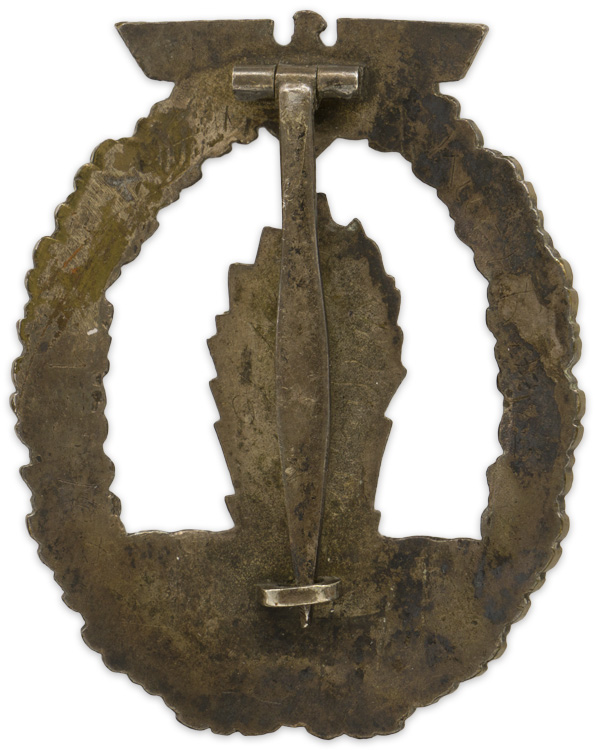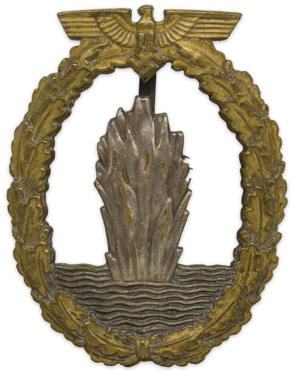 PHYSICAL DESCRIPTION: Die struck, solid backed, alloy construction badge with gilt, silver and grey washes. The badge is in the form of a gilt washed, vertically oval, oak-leaf wreath with national eagle, with outstretched wings, superimposed to the top center, encompassing a grey washed, horizontal waves and a silver washed, cut-out, vertical, exploding, water funnel. Complete pin and catch assembly. Nice convex shape!