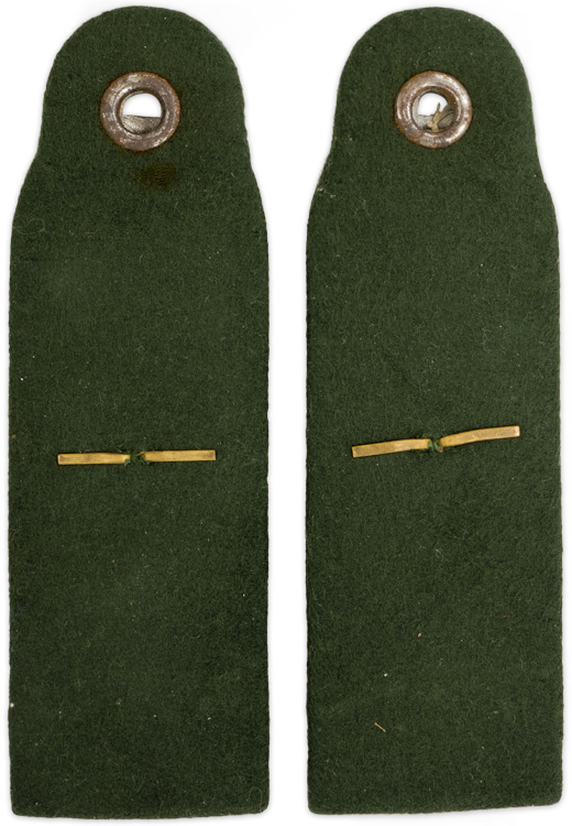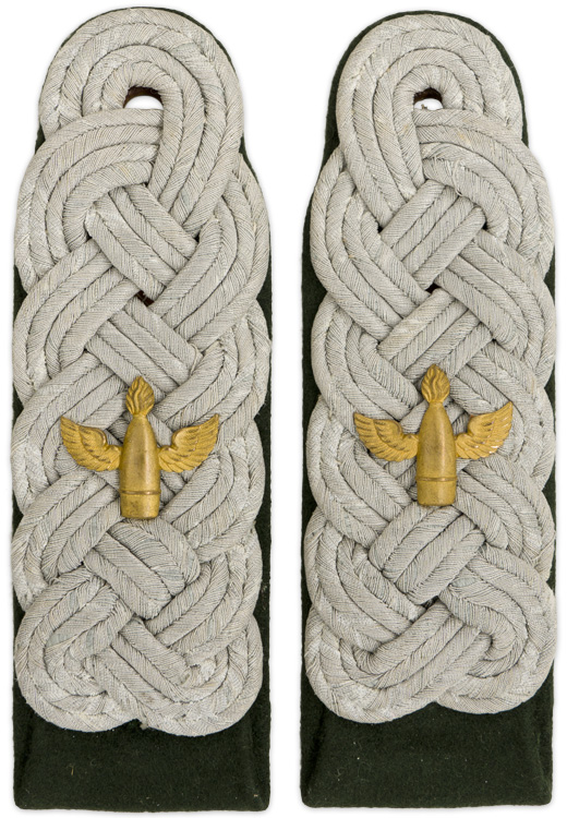 PHYSICAL DESCRIPTION: Sew on shoulder boards of interwoven, matte silver/aluminum Russian braid mounted on olive/field-grey wool waffenfarbe base. Stamped alloy artillery career cypher consisting of a dual crossed canon barrels.