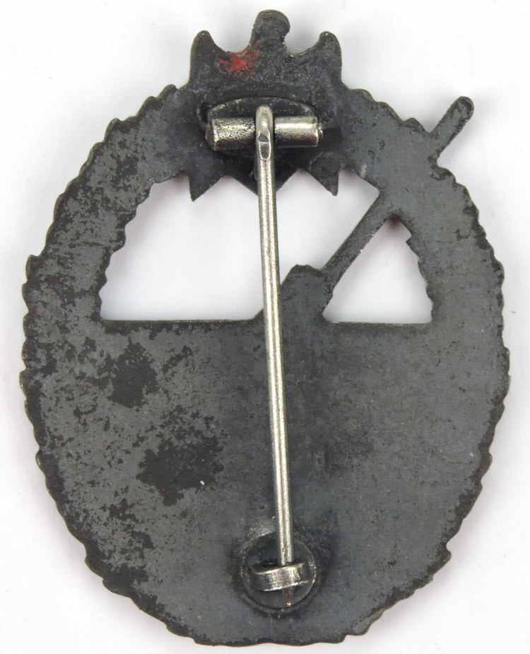 PHYSICAL DESCRIPTION: Die struck, alloy construction badge in the form of a gilt washed, vertically oval, oak-leaf wreath with a national eagle with down-swept wings, clutching a canted swastika in it’s talons, superimposed to the top center, encompassing the silver washed, cut-out likeness of an 88mm coastal artillery gun with the barrel of the gun extending beyond the edge of the wreath. Complete pin and catch assembly. Steinhauer & Lück production.