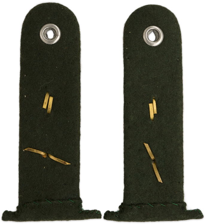 PHYSICAL DESCRIPTION: "Pass through" style shoulder boards in bright, silver/aluminum Russian braiding, mounted on a dark green wool base. Coastal artillery cyphers and single rank pips.