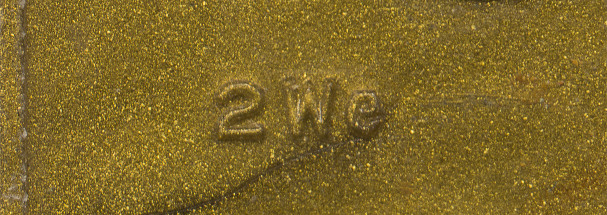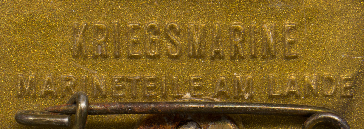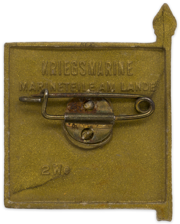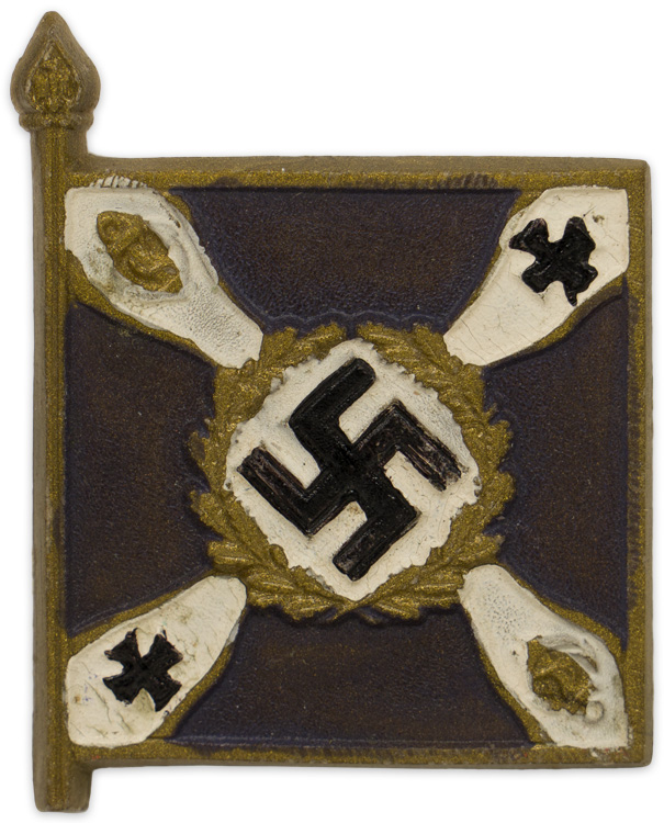 PHYSICAL DESCRIPTION: Molded grey protoplastic miniature toy Standard with embossed and painted detailing. The Standard features a central, embossed Swastika, encompassed by a circular oak-leaf wreath. The central motif is flanked at all four corners by an embossed, canted, anchors and Iron Crosses. The hoist edge of the Standard has the suspension staff with the Wehrmacht style eagle. The reverse of the Standard has embossed script, "KREIGSMARINE, MARINETEILE AM LANDE", and "2We". The reverse also has its original horizontal pin back device intact. Neat item.