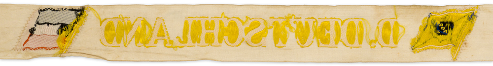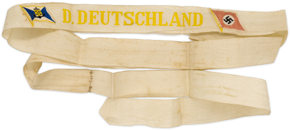 Roughly 32mm x 160cm, machine woven "D. DEUTSCHLAND" cap talley. One sewing repair. Shows the expected age.