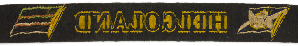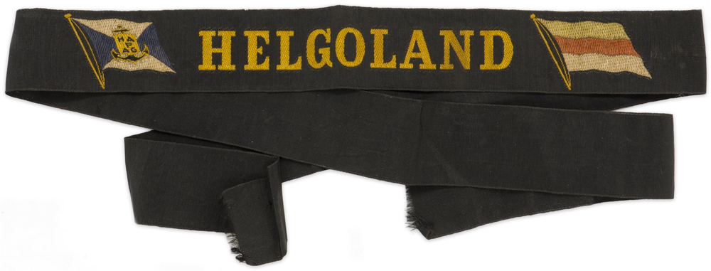 Roughly 32mm x 92cm, machine woven "HELGOLAND" cap talley. German WW2 Era Hamburg-America Line Ocean Line.