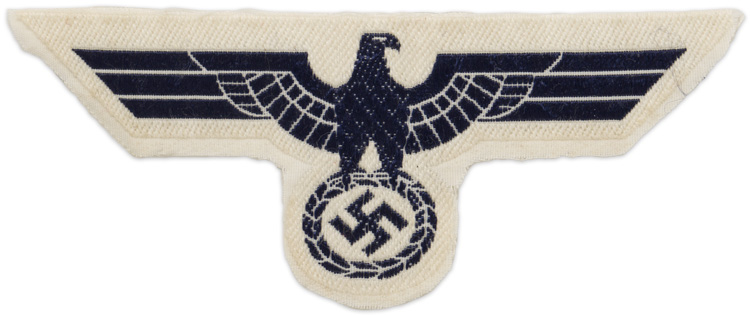 BACKGROUND: German Naval uniforms and headgear were based on traditional designs that date back to the creation of the Prussian Navy in 1848, and although uniforms and headgear did evolve during the interim years many items used during the Third Reich would still have been quite recognizable to the Imperial sailor. The Kriegsmarine adopted wear of the new national eagle on the front of the headgear and the right breast of the uniform on March 24TH 1934. The Kriegsmarine’s version of the national eagle was identical to the army version except for the coloration with the army utilizing silver, white and grey eagles while the Kriegsmarine utilized golden yellow eagles. Of Note: The only exceptions in the coloration of the Kriegsmarine eagles was that personnel serving in the Administrative branch utilized a silver eagle while eagles worn on the white jumper shirts were in cornflower blue. Due to the silver insignia the Administrative personnel were contemptuously referred to as Silberlinge, (Silvered Ones). Generally officer’s ranks utilized hand embroidered breast eagles while EM/NCO’s ranks utilized machine embroidered or machine woven breast eagles. Originally a metal eagle was authorized for wear on the white pullover "jumper" shirt until regulations of November 13TH 1935 dictated that a machine embroidered, cornflower blue eagle was the only eagle permissible for wear on that garment. Additional regulations of October 19TH 1936 altered the white "jumper" shirt’s machine embroidered eagle to a machine woven eagle for the duration of the war.