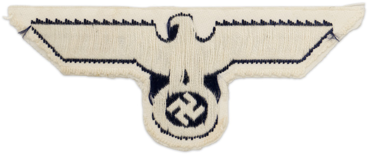 PHYSICAL DESCRIPTION: Machine woven breast eagle with out-stretched wings, clutching a wreathed, canted, swastika in it’s talons, in cornflower blue rayon threads on a woven, white, rayon base. This one has some cleaning solution contamination giving is a faint UV feedback. No doubt frombeing washed while on the uniform. Uniform removed.