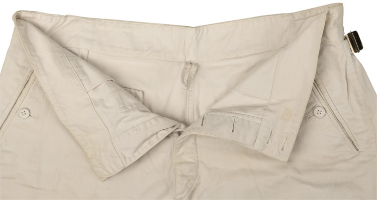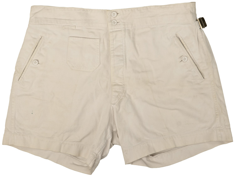 PHYSICAL DESCRIPTION: Light weight white cotton twill construction short pants feature a vertical, four button French fly with An additional two at the waistband. The shorts have two, diagonally angled, slash front pockets and a small, horizontal watch pocket situated just below the right front waistband.There are no longer any visible markings, they are most probably there but now obscured by age or wear. The shorts are roughly size 34/36" waist.