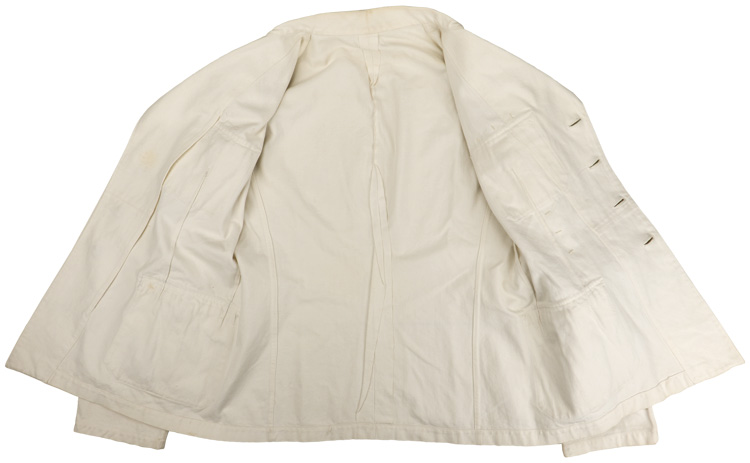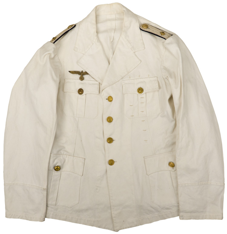 BACKGROUND: German Naval uniforms and headgear were based on traditional designs that date back to the creation of the Prussian Navy in 1848, and although the uniforms and headgear did evolve during the interim years, many items used during the Third Reich would still have been quite recognizable to the Imperial sailor. The German navy also had a long tradition of brown and white tropical/landing dress that was worn in hot climates with the white uniform also serving as a walking out dress. The tradition was continued through the Weimar era and in 1929 the Reichsmarine introduced new brown and white tropical/landing dress uniforms with stand-up collars. In 1937 the Kriegsmarine introduced new style brown and white tropical uniforms with lay down collars. With the impending entrance into the North African campaign in late 1940 the Kriegsmarine developed another new tropical brown uniform independently from the Heer and Luftwaffe, but retained the 1937 pattern white uniform. The tropical uniforms were classed as Sonderbekleidungsstücke, (Special Articles of Clothing), and were only issued to personnel serving in tropical climates. Officers and certain senior NCO ranks were responsible for purchasing their own uniforms and headgear and as a result were allotted a clothing allowance through the OKK, Offizier Kleiderkasse der Kriegsmarine, (Officer’s Clothing Account of the Navy). Although enlisted personnel were issued their uniforms and headgear from government supplies they were also permitted to purchase privately tailored items although the price may have been restrictive. Generally speaking officers bought nice quality, private purchase, uniform items but they could also choose to buy their uniforms directly from the military clothing depots. This example is the 1937 pattern, white tropical tunic.