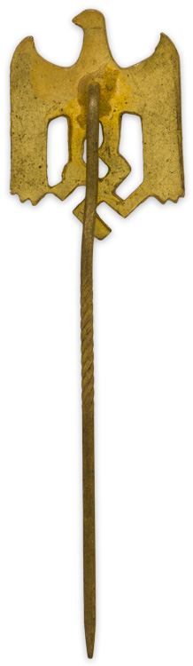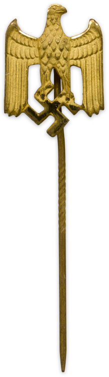 PHYSICAL DESCRIPTION: Nice quality, fire gilted, die struck, soldier’s and official’s civilian clothing lapel pin in the form of a Wehrmacht style eagle with down-swept wings clutching a canted swastika in its talons. The eagle shows nice detailing to its wings and breast and intricate cut-outs between its wings, legs and the arms of the swastika. The fire gilted finish is fully retained with minor age dulling. The solid reverse has its soldered vertical, rifled stickpin intact. Unmarked example. Attractive lapel pin and hard to find in the KM coloration.