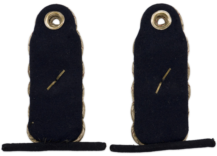 PHYSICAL DESCRIPTION: Passthrough style on shoulder boards with interwoven bright silver/aluminum Russian braiding with a single, gilt washed, stamped alloy rank pip to each, mounted on a very deep navy blue wool bases.