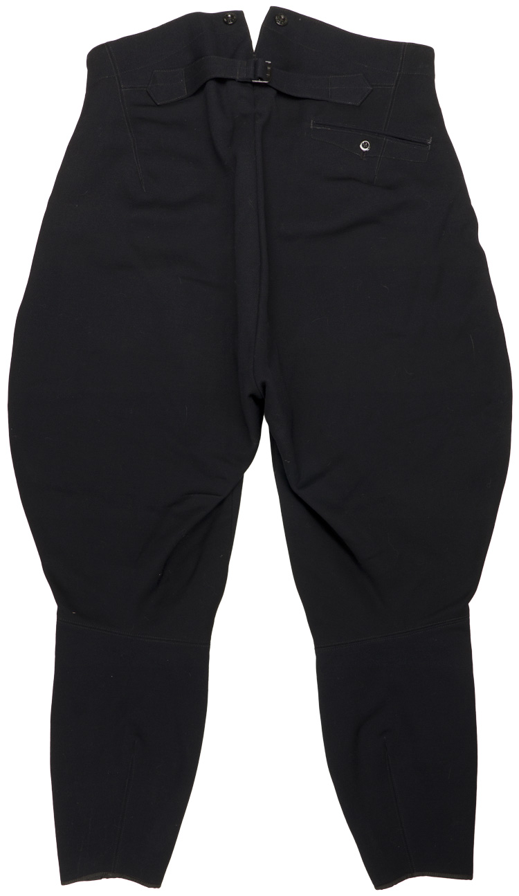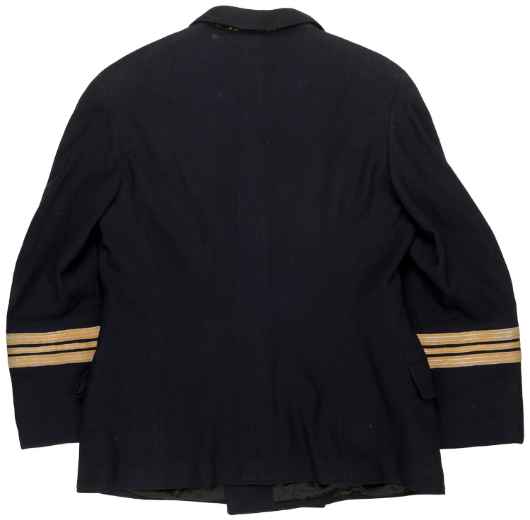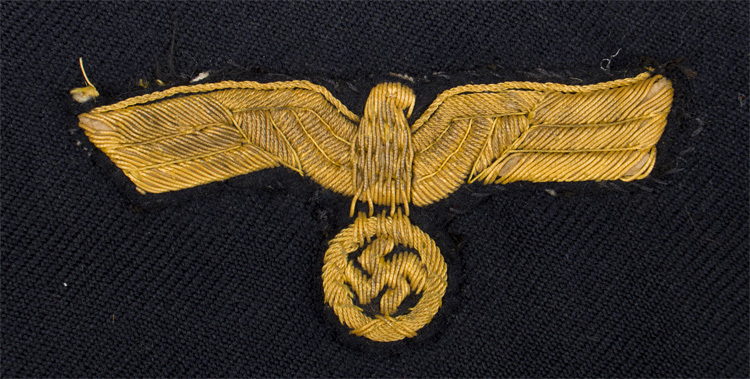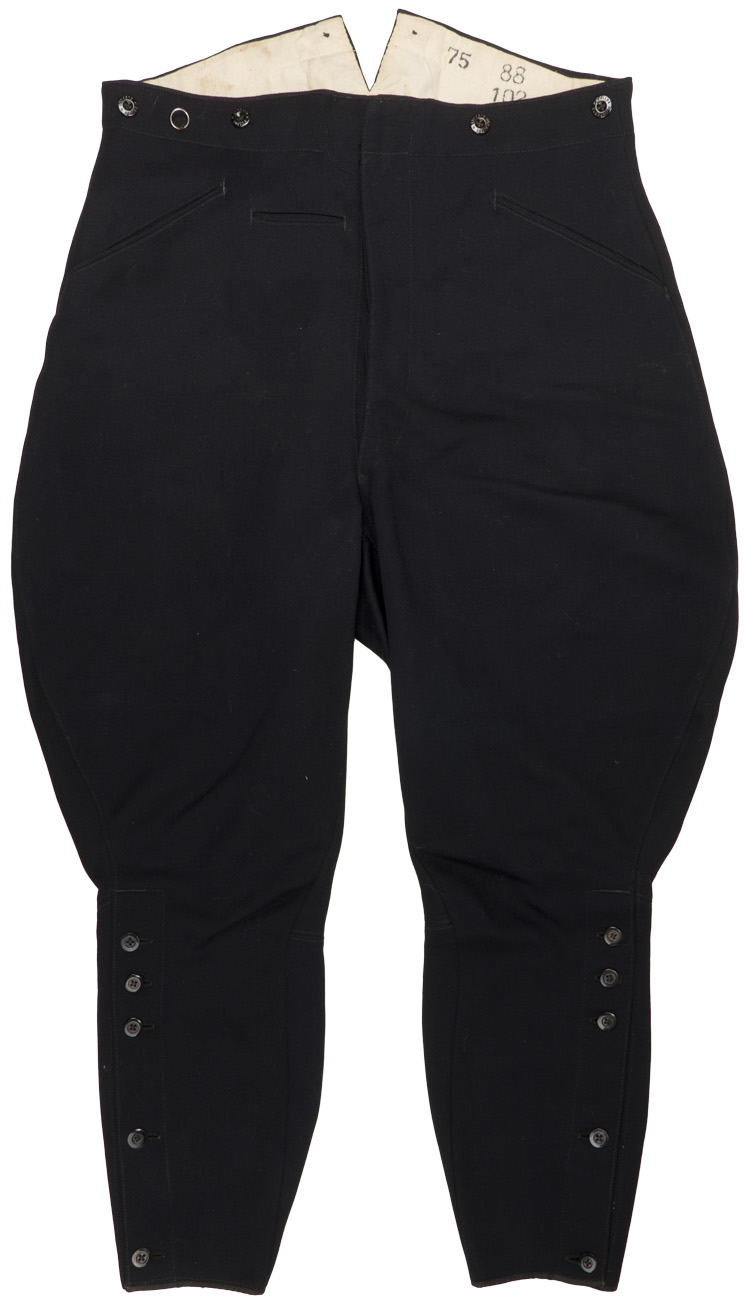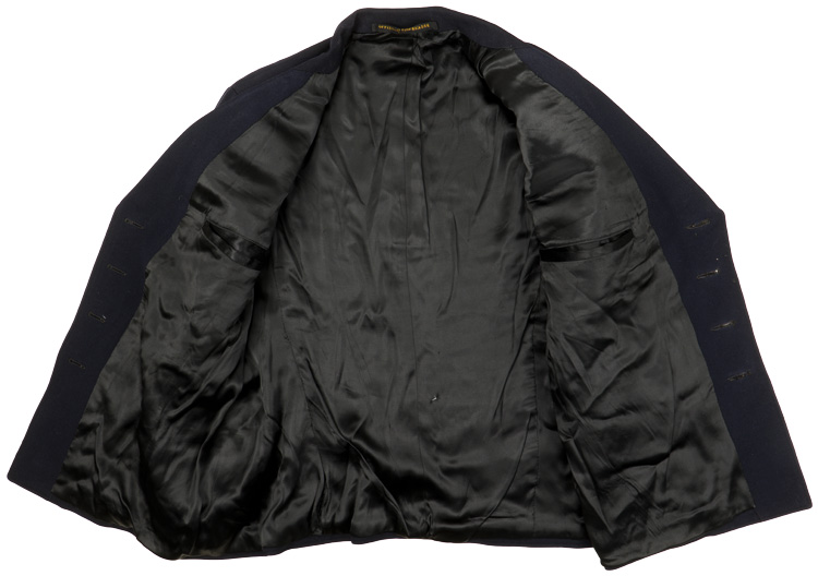 PHYSICAL DESCRIPTION: Nice quality, navy blue wool, double breasted jacket with fine whipcord weave. Opened neck jacket features fold back up-swept peak lapels and two parallel rows of five fire gilted, fouled anchor buttons with corresponding button holes to either side of front closure. Jacket also has an additional fire gilted fouled anchor button under each fold back lapel. Left breast has a slightly diagonally angled slash pocket. Original award loops for two badges and a ribbon bar. Right breast with hand embroidered national eagle in bright golden yellow celleon threads with tan accent threads. Eagle is mounted on a cut-out navy blue wool base which is neatly handstitched to jacket. Jacket has two horizontal slash hip pockets with straight edged flaps. Lower forearm of each sleeve has three horizontal, regulation patterned golden yellow celleon rank tress stripes roughly 4 1/4" above cuffs. Tress stripes consist of two 9/16" wide stripes flanking a 3/8" wide central stripe. Situated just above the rank tress stripes on each sleeve is the career insignia consisting of a hand embroidered five point star in golden yellow celleon on a circular navy blue wool base. Tress stripes and career insignia indicate a Kapitänleutnant Seeoffizier, (Officer of the Line). Tress stripes are machine stitched to sleeves and career insignia is neatly handstitched to sleeves. Interior fully lined in navy blue rayon with white striped sleeves. Lining has a horizontal slash pocket to each breast. Buttons look to be original stitching. Very nice example. Jacket roughly size 40" chest. Come with a superb pair of size 34 breeches. Nice set.