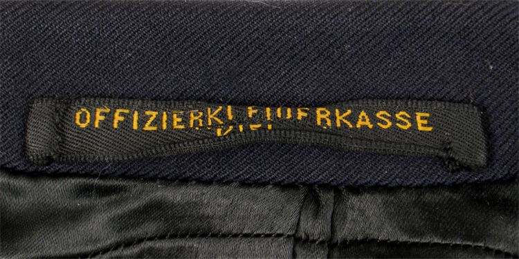 BACKGROUND: German Naval uniforms and headgear were based on traditional designs that date back to the creation of the Prussian Navy in 1848, and although the uniforms and headgear did evolve during the interim years, many items used during the Third Reich would still have been quite recognizable to the Imperial sailor. The Pea jacket was a basic, traditional, uniform item issued to enlisted personnel and Junior NCO’s, with minor variations, and followed the basic design of the Imperial German Navy and Reichsmarine Pea jackets. The most easily visible difference between the Reichsmarine and Kriegsmarine era Pea jackets was the Reichsmarine era Pea jackets had two, vertical, rows of six, visible, front closure buttons while the Kriegsmarine era Pea jackets had two, vertical, rows of five, visible front closure buttons with an additional button hidden beneath each lapel. On later produced Third Reich era Pea jackets the buttons under the lapels were usually omitted. The early Third Reich era Pea jackets were manufactured with a single back panel until regulations of 1939 altered the construction to two back panels with a central, vertical seam. Officers and certain senior NCO ranks were responsible for purchasing their own uniforms and headgear and as a result were allotted a clothing allowance through the OKK, Offizier Kleiderkasse der Kriegsmarine, (Officer’s Clothing Account of the Navy). Although enlisted personnel were issued their uniforms and headgear from government supplies they were also permitted to purchase privately tailored items although the price may have been restrictive. Generally speaking officers bought nice quality, private purchase, uniform items but they could also choose to buy their uniforms directly from the military clothing depots.