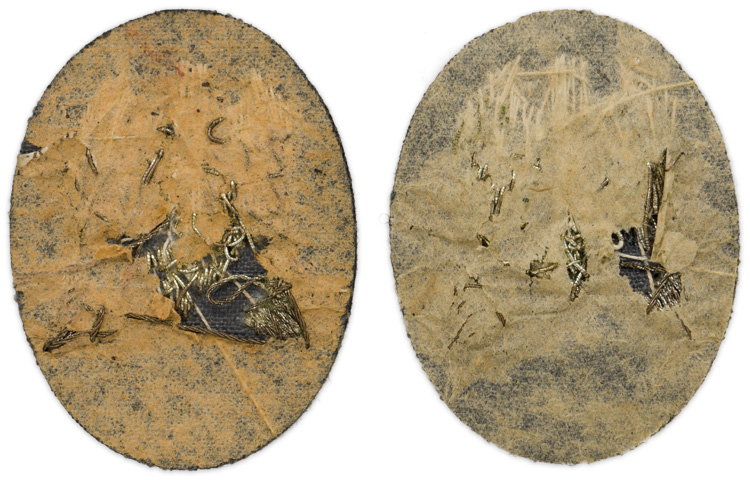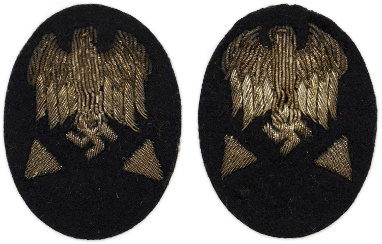 PHYSICAL DESCRIPTION: The Technical Officials, elevated grade career insignia consists of two roughly, 50mm tall, 40mm wide, vertically oval, navy blue wool bases with a hand embroidered Wehrmacht pattern national eagles with down swept wings, clutching a canted swastika’s, in bright silver/aluminum wire and bullion threads. The eagle are positioned above two, career grade, identifying triangles, also hand embroidered in bright, silver/aluminum wire threads. The reverse of the insignia still has its original protective tan paper backing intact.