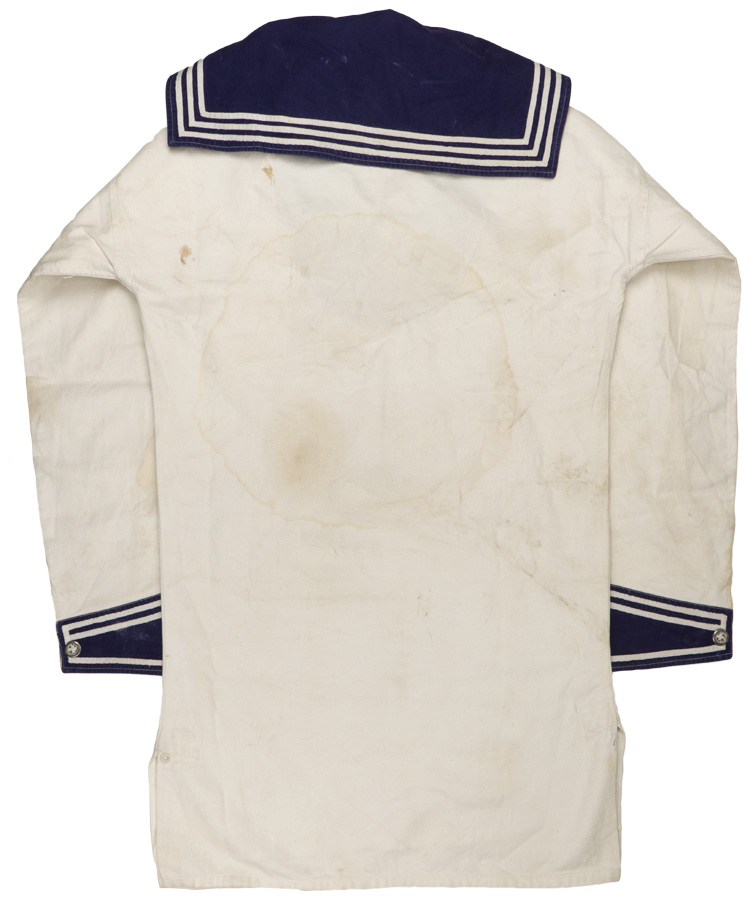 PHYSICAL DESCRIPTION: Standard issue, mid-weight, brushed, white cotton construction, pullover style, jumper shirt features a central, vertical, V-neck slash opening with dual, white, cotton tie tapes and an integral, fold back, blue nankeen rectangular collar. Original removable metal breast eagle (Rare to see with this type!). The shirt has a long tail skirt with small, vertical, "V" slashes to each outside seam and small, horizontally rectangular, dual-ply, reinforcement panels with dual, stitched eyelets to each, designed to secure the underpants to the shirt. Chest size 36/38". Nice!