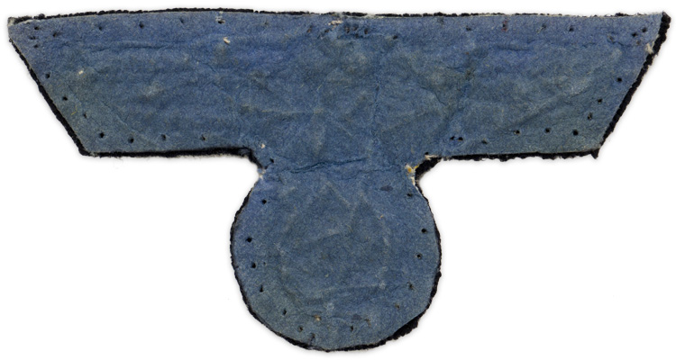 PHYSICAL DESCRIPTION: Nice quality, hand embroidered visor cap eagle with out-stretched wings, clutching a wreathed, canted, swastika in it’s talons, in heavy gilt wire threads with black cotton accent threads, on a cut-out, navy blue, wool base. Removed from a cap.