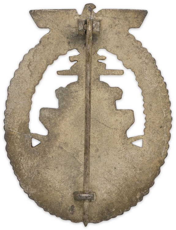 PHYSICAL DESCRIPTION: Die struck, solid backed, nicely convexed,zinc alloy construction award features a vertically oval oak-leaf wreath with a national eagle with out-stretched wings superimposed to the top center, encompassing a nicely detailed, cut-out, "face on", likeness of the battleship Bismarck cutting through waves. The reverse of the badge is well marked with the stylized, embossed, manufacturer’s initials, "f.o.", indicating manufacture by Friedrich Orth of Vienna. Complete pin and catch assembly. One of the harder makers to find.