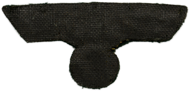 PHYSICAL DESCRIPTION: Hand embroidered national eagle in gold celleon threads on a cut-out blue/green badge cloth base. The reverse of the base still has its original protective backing intact. Very hard to find eagle!