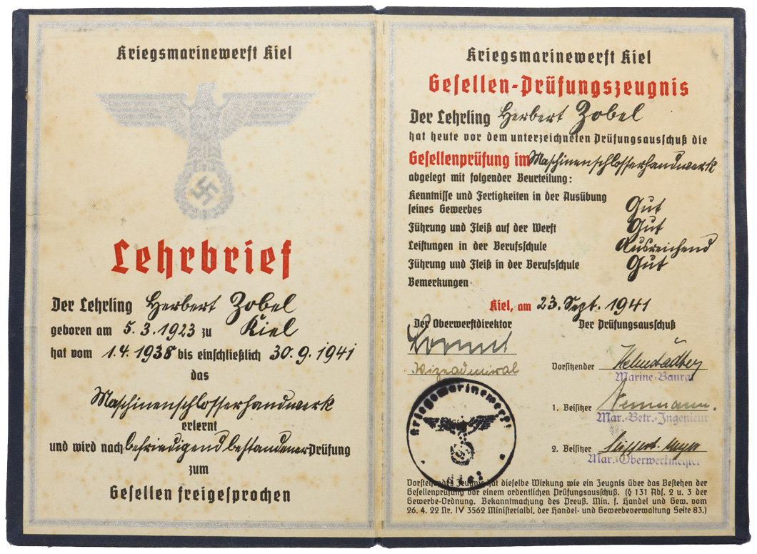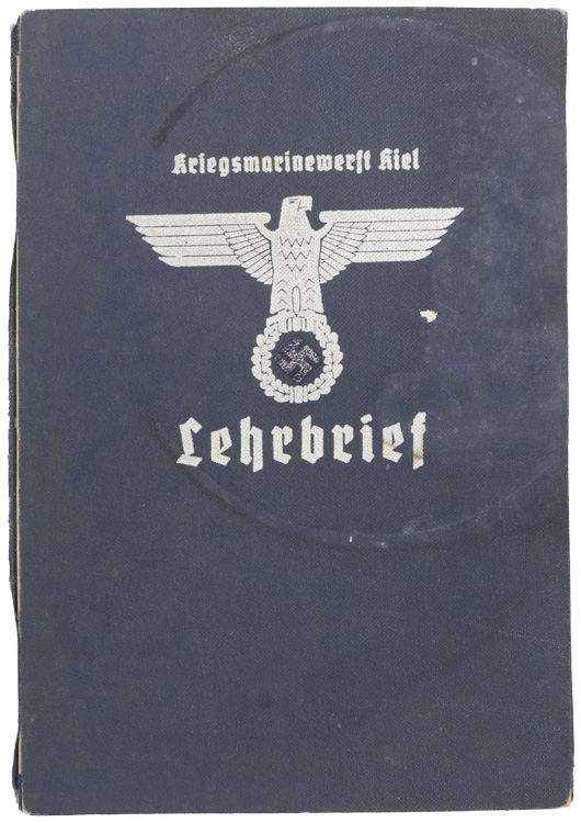 A blue, pebble, bi-fold 12.5cm x 18cm document that has embossed to the cover "Kriegsmarinewerft Kiel Training Certificate" along with a de-nazified eagle. The document is dated for 1941, while the included document of Graduation or completion is dated for 1937 and is named to the same individual.
