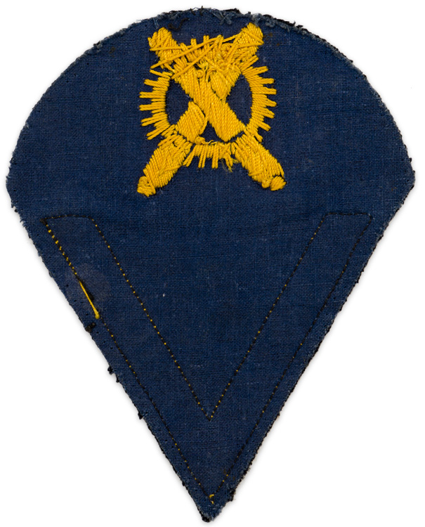 PHYSICAL DESCRIPTION: The insignia consists of a navy blue wool base with an inverted triangular bottom and a semi-circular top. The top of the base has machine embroidered, multi-cogged wheel superimposed on crossed artillery barrels in golden yellow threads positioned above a single rank chevron. The rank chevron is machine stitched to the wool base.