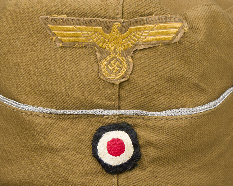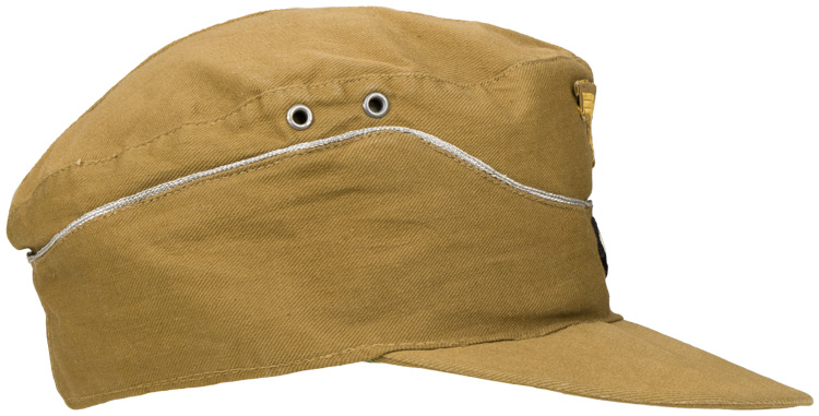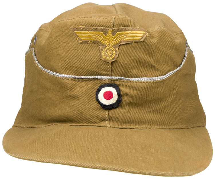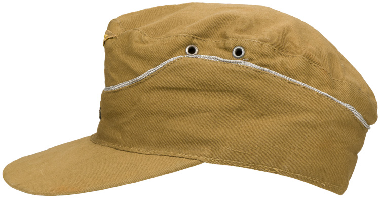 BACKGROUND: German Naval uniforms and headgear were based on traditional designs that date back to the creation of the Prussian Navy in 1848, and although the uniforms and headgear did evolve during the interim years, many items used during the Third Reich would still have been quite recognizable to the Imperial sailor. The German navy also had a long tradition of brown and white tropical/landing dress that was worn in hot climates with the white uniform also serving as a walking out dress. The tradition was continued through the Weimar era and in 1929 the Reichsmarine introduced new brown and white tropical/landing dress uniforms with a stand-up collars. In 1937 the Kriegsmarine introduced new style brown and white tropical uniforms with lay down collars. With the impending entrance into the North African campaign in late 1940 the Kriegsmarine developed another new tropical brown uniform independently from the Heer and Luftwaffe, but retained the 1937 pattern white uniform. The new, (1940), tropical brown uniforms also included headgear. The tropical M41 cap was similar in design to the later M43 caps but without the fold down side panels. Officer’s M41 field caps were distinguished from EM/NCO’s caps by the addition of a golden yellow soutache piping on the crown edge and/or the scalloped front edge while Administrative Officials utilized silver piping. Of Note: Due to the silver insignia the Administrative personnel were contemptuously referred to as Silberlinge, (Silvered Ones).