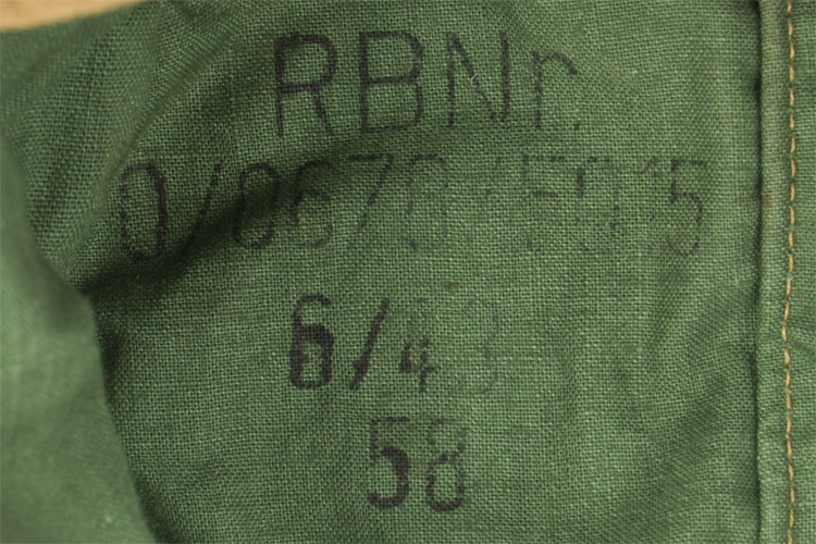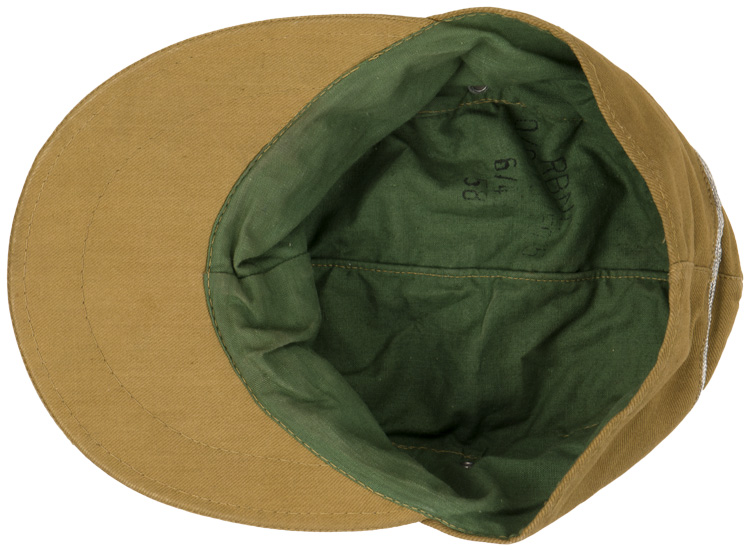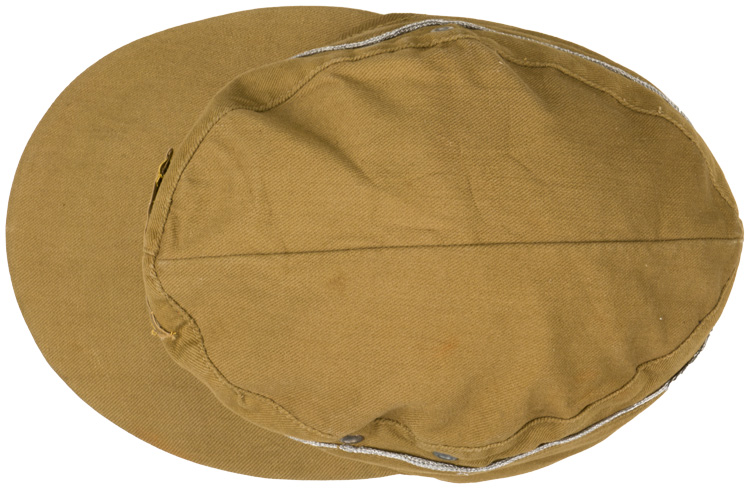 PHYSICAL DESCRIPTION: Light weight, ribbed tan, cotton twill construction cap features, dual-ply, stitched down side and back panels with a gently scalloped downward slope to the front center. The top edge of the dual-ply panels are piped in bright, interwoven silver/aluminum braid indicating an Administrative official with the equivalent of officers rank. The cap has two, natural alloy ventilation grommets to each side positioned just below the outer edge of the crown seam. The top center seam is correctly stitched right through the interior liner for added strength. The front center of the cap has a machine woven national eagle in golden yellow threads on a cut-out woven tan rayon base. The front center of the dual-ply, downward sloping scalloped panel has a machine woven national tri-color cockade on a diamond shaped, woven tan rayon base. Both pieces of insignia are neatly handstitched to the cap. Eagles stitching is starting to pull loose, but is still firmly held in place. The cap has an extended, cotton twill covered, forward visor with an internal stiffener with a subtly raised lip to the forward edge. The interior of the cap is fully lined in light weight, green cotton twill. The lining is well marked with a black size inkstamp, "58", and the manufacturers Rbnr# code. Nice clean cap. Scarce.