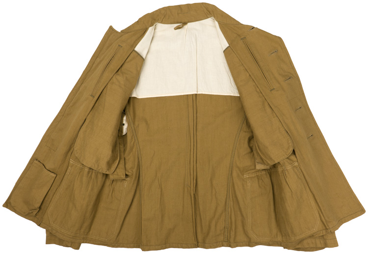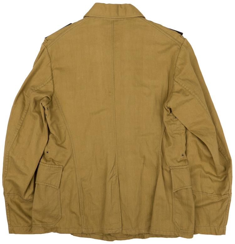 PHYSICAL DESCRIPTION: Nice quality, private purchase, 1940 pattern, mid-weight, tan, cotton construction tunic with a pronounced, vertical ribbing, features a vertical, five button front closure with small fold back lapels and a lay down collar. The tunic has four pleated, patch, front pockets with scalloped button down flaps. The right breast has two, small, vertical and one horizontal thread loop for securing a removable breast eagle. The tunic comes with a removable, gilt washed, alloy construction national eagle with out-stretched wings, clutching a wreathed, canted swastika in its talons. Eagle is in nice complete condition. The side panels each have a single, stitched eyelet positioned at the waistline, for the belt support hooks. The straight cut, non-adjustable sleeves have dual-ply, simulated French cuffs. The tunic has nine, stitched, ventilation eyelets to each armpit. Comes with a nice pair of slip on Oberfeldwebel’s Engineers shoulder straps. The lay down collar has no collar tabs as per regulations. The unlined interior has small, ribbed, cotton twill reinforcement panels at the armpits and two, vertical, ribbed, cotton twill straps with dual stitched eyelets to each for the belt support hooks. Buttons are the removable type and are all in nice condition. The tunic is roughly a size 38" chest. Nice tunic!