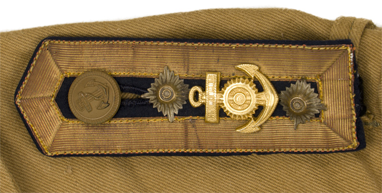 BACKGROUND: German Naval uniforms and headgear were based on traditional designs that date back to the creation of the Prussian Navy in 1848, and although the uniforms and headgear did evolve during the interim years, many items used during the Third Reich would still have been quite recognizable to the Imperial sailor. The German navy also had a long tradition of brown and white tropical/landing dress that was worn in hot climates with the white uniform also serving as a walking out dress. The tradition was continued through the Weimar era and in 1929 the Reichsmarine introduced new brown and white tropical/landing dress uniforms with stand-up collars. In 1937 the Kriegsmarine introduced new style brown and white tropical uniforms with lay down collars. With the impending entrance into the North African campaign in late 1940 the Kriegsmarine developed another new tropical brown uniform independently from the Heer and Luftwaffe, but retained the 1937 pattern white uniform. Included with the 1940 pattern tropical brown uniform were service tunics, field blouse and both short and long pants. The tropical uniforms were classed as Sonderbekleidungsstücke, (Special Articles of Clothing), and were only issued to personnel serving in tropical climates. Officers and certain senior NCO ranks were responsible for purchasing their own uniforms and headgear and as a result were allotted a clothing allowance through the OKK, Offizier Kleiderkasse der Kriegsmarine, (Officer’s Clothing Account of the Navy). Although enlisted personnel were issued their uniforms and headgear from government supplies they were also permitted to purchase privately tailored items although the price may have been restrictive. Generally speaking officers bought nice quality, private purchase, uniform items but they could also choose to buy their uniforms directly from the military clothing depots.