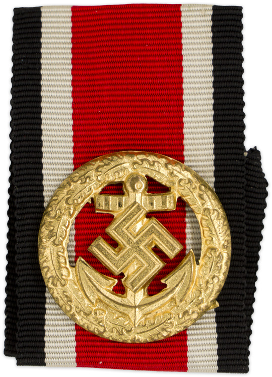 PHYSICAL DESCRIPTION: Roughly, 26mm diameter, hollow backed, die struck, alloy construction award with a bright, fire gilted finish with polished high lights. The award is in the form of an embossed, circular oak-leaf wreath encompassing a cut-out, canted swastika superimposed on a vertical anchor. The detailing includes a slightly off-set, circular, recess to the top ring of the anchor while the bottom edges of the anchor rest on the edge of the oak-leaf wreath. The award retains all of its fire gilted finish and is still quite clean and bright. The hollow reverse is a mirror image of the obverse and all four, small, soldered attachment prongs are intact (One is broken, but still attached to the ribbon). Original ribbon is also present. Nice, untouched original example.