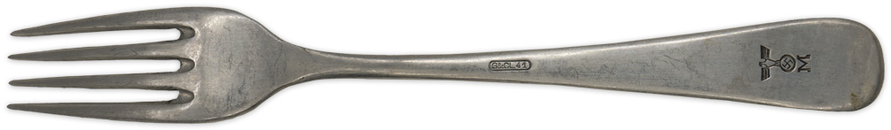 PHYSICAL DESCRIPTION: The single piece, tooled alluminum construction mess hall/galley four tine fork is roughly, 21.5cm long. The obverse of the handle has a low, central ridge and the reverse is well marked with an impressed Eagle with three feathers, indicating Kriegsmarine issue over "M".