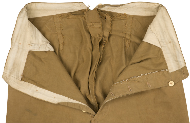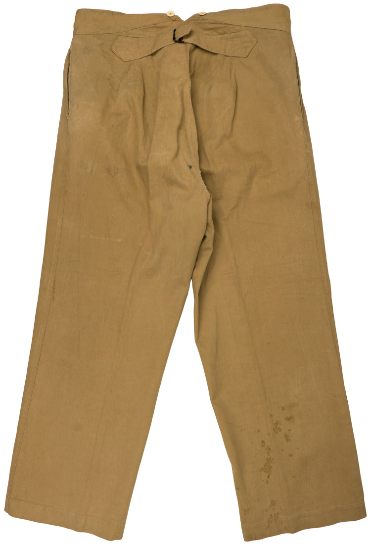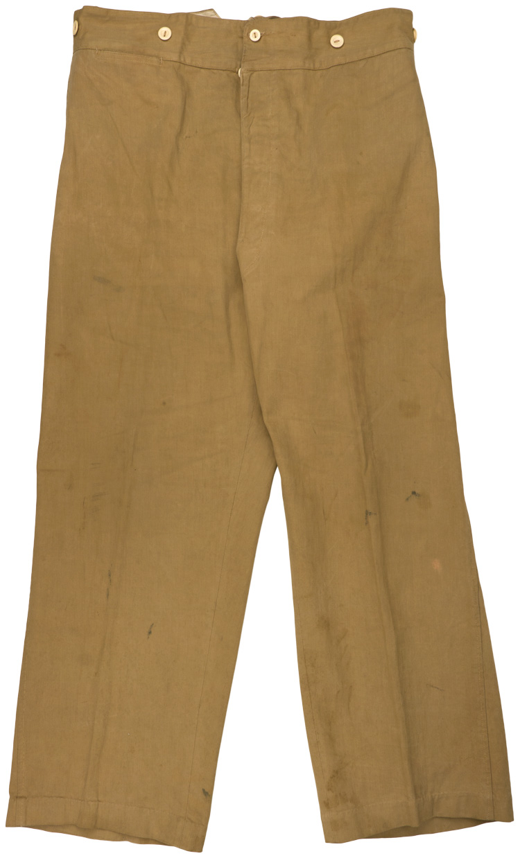 German Naval uniforms and headgear were based on traditional designs that date back to the creation of the Prussian Navy in 1848, and although the uniforms and headgear did evolve during the interim years, many items used during the Third Reich would still have been quite recognizable to the Imperial sailor. The German navy also had a long tradition of brown and white tropical/landing dress that was worn in hot climates with the white uniform also serving as a walking out dress. The tradition was continued through the Weimar era and in 1929 the Reichsmarine introduced new brown and white tropical/landing dress uniforms with stand-up collars. In 1937 the Kriegsmarine introduced new style brown and white tropical uniforms with lay down collars. With the impending entrance into the North African campaign in late 1940 the Kriegsmarine developed another new tropical brown uniform independently from the Heer and Luftwaffe, but retained the 1937 pattern white uniform. Included with the 1940 pattern tropical brown uniform were service tunics, field blouse and both short and long pants. The tropical uniforms were classed as Sonderbekleidungsstücke, (Special Articles of Clothing), and were only issued to personnel serving in tropical climates. Officers and certain senior NCO ranks were responsible for purchasing their own uniforms and headgear and as a result were allotted a clothing allowance through the OKK, Offizier Kleiderkasse der Kriegsmarine, (Officer’s Clothing Account of the Navy). Although enlisted personnel were issued their uniforms and headgear from government supplies they were also permitted to purchase privately tailored items although the price may have been restrictive. Generally speaking officers bought nice quality, private purchase, uniform items but they could also choose to buy their uniforms directly from the military clothing depots.PHYSICAL DESCRIPTION: Private purchase tan colored tropical trousers. No markings that I can see. Buttons all look ti be original stitching. Roughly a size 36" waist. Shows the expected period use and wear but overall nice condition. Possibly Luftwaffe as well.