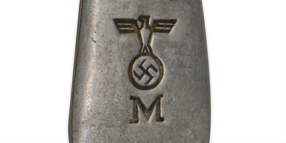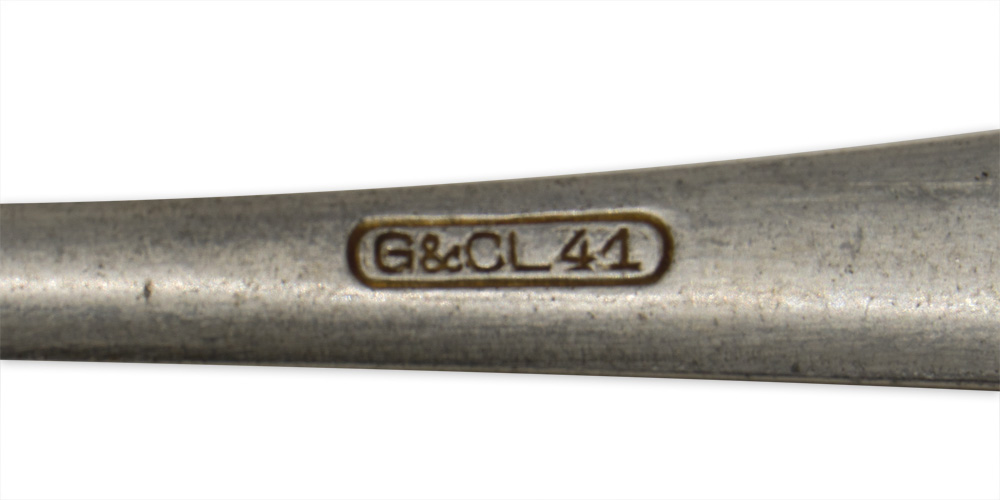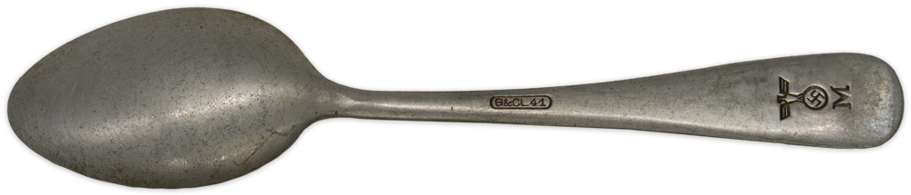 PHYSICAL DESCRIPTION: The single piece, natural aluminum construction mess hall/galley tablespoon is roughly, 14cm long with a roughly, 29mm wide "bowl". The obverse of the handle has a low, central ridge and the reverse is well marked with an impressed Eagle over "M", indicating Kriegsmarine issue. Marked "G&CL 41".