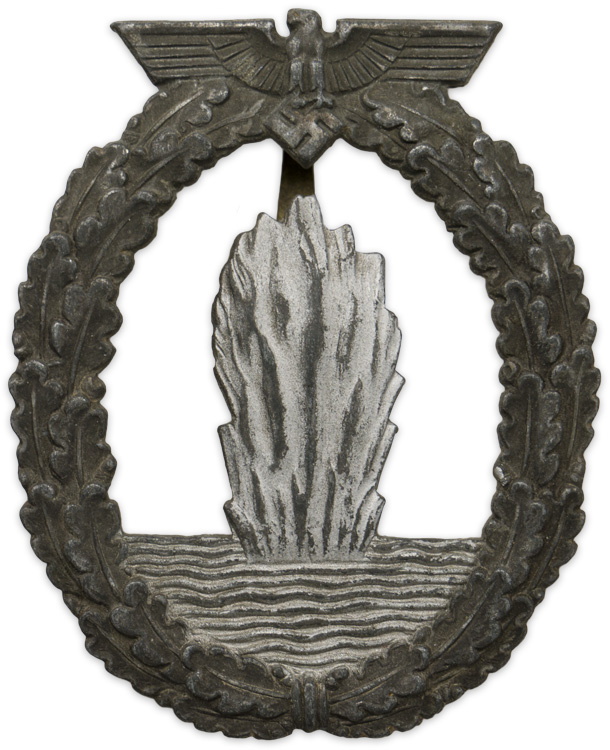 PHYSICAL DESCRIPTION: Solid backed, zinc construction badge with gilt and frosty silver washes. The badge is in the form of a gilt washed, vertically oval, oak-leaf wreath with a national eagle, with outstretched wings, clutching a canted swastika superimposed to the top center, encompassing frosty silver washed, horizontal waves and a cut-out, vertical, exploding, water funnel. The reverse of the badge has an integral, solid block type hinge, a broad, tapering, vertical pin and a soldered catch on a circular base plate inset into a circular recess all intact. The reverse is well marked with embossed manufacturer's initials, "R.K.", indicating manufacture by Rudolf A. Karneth & Sohn, Gablonz.