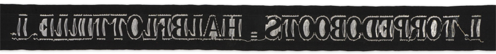 A 32mm tall x 70cm long, black silk construction cap talley with machine woven script in silver thread "I. Torpedoboots Halbflottille I." The ends of the cap talley have a rounded cut .