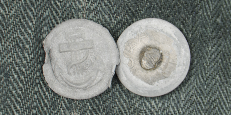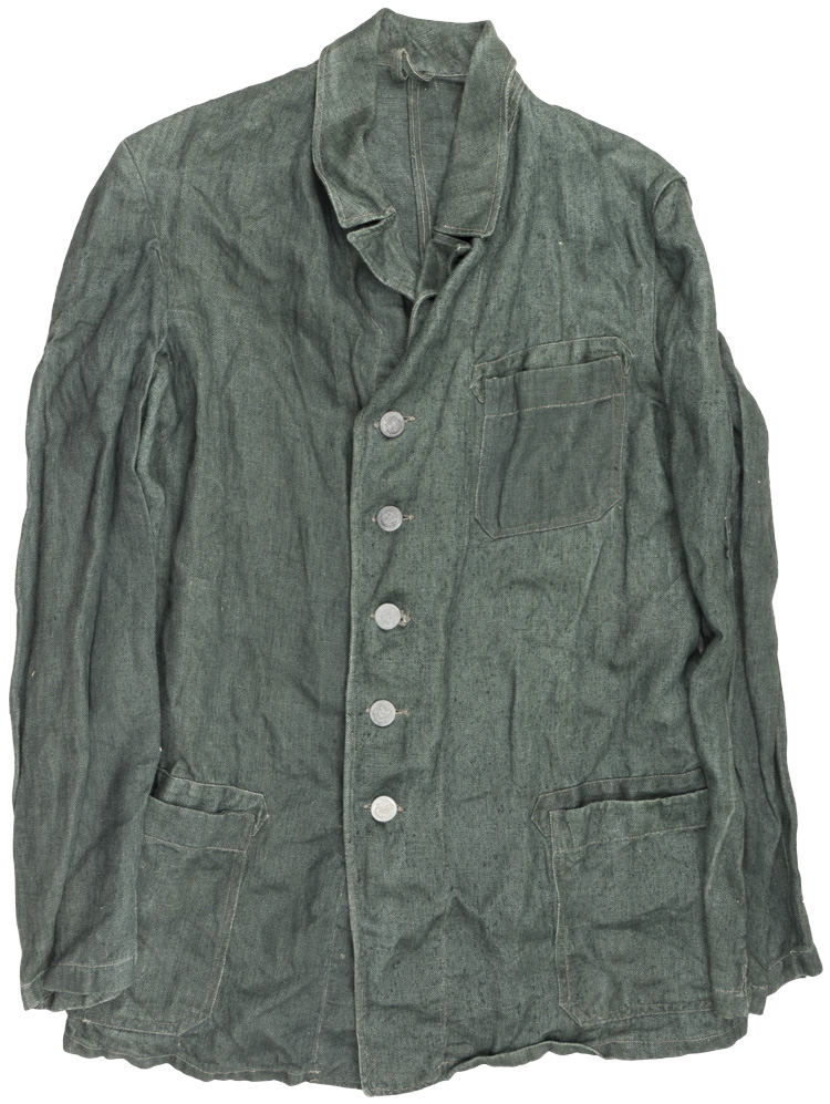 PHYSICAL DESCRIPTION: Green cotton/rayon blend construction work/drill tunic with an HBT weave. Tunic features a five button front closure with an open lay down collar. Tunic has two, non-pleated, patch hip pockets with non-flapped horizontal slash openings. Sleeves have straight cut, non-adjustable cuffs. Tunic has no insignia and no evidence of any ever having been applied. Lack of insignia indicates usage by enlisted personnel, as per regulations. Front closure buttons are the field-grey painted, stamped alloy type with an embossed fouled anchor on a pebbled background field with a raised outer rim. The front has come off one button, but is included. Buttons are the removable type with "S" ring retainers and retain all of their original field-grey paint. Roughly a size 36" chest. Nice clean example.