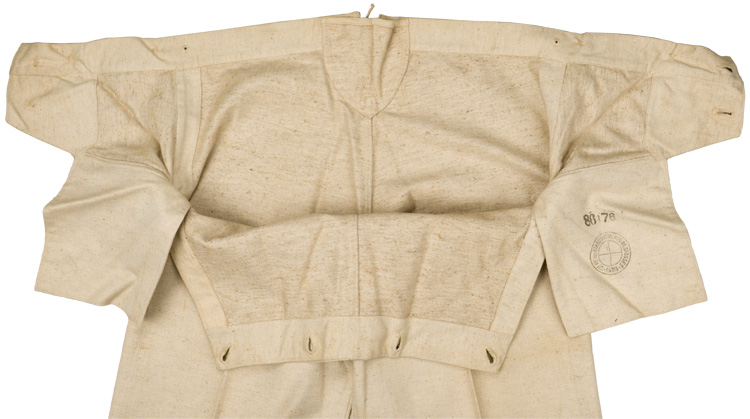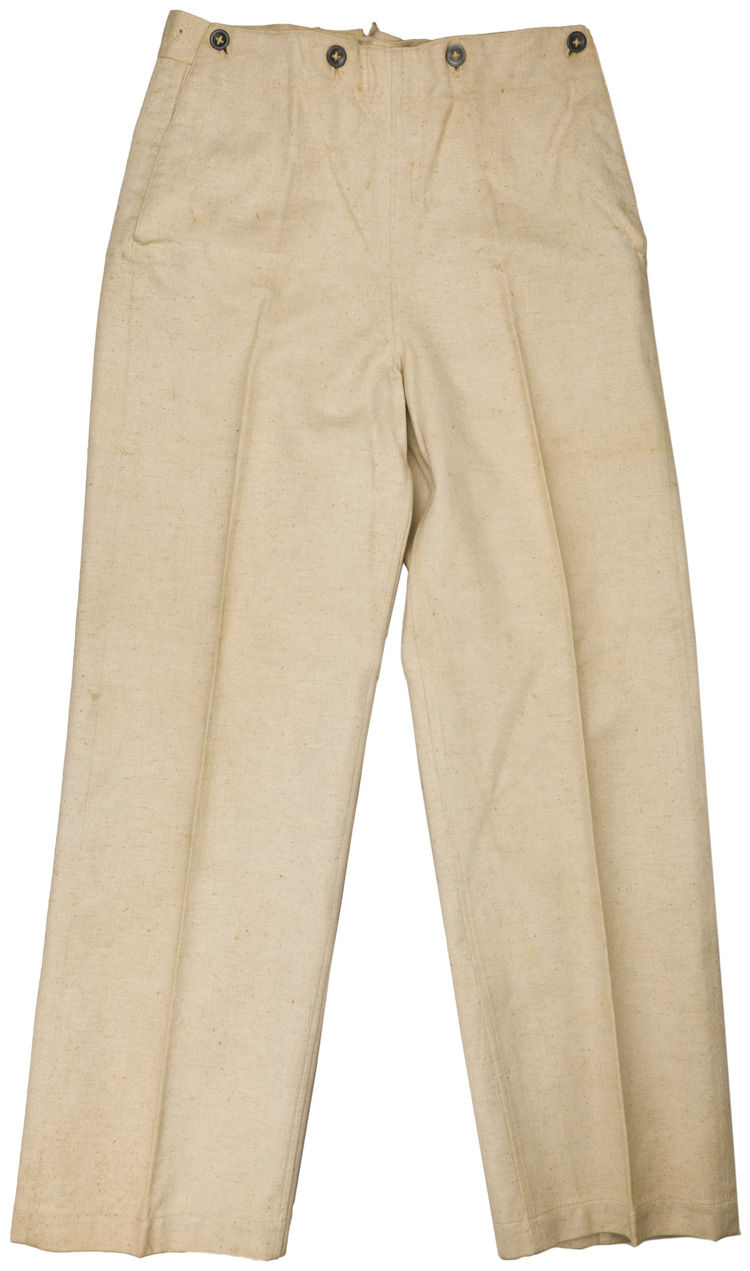 BACKGROUND: German Naval uniforms and headgear were based on traditional designs that date back to the creation of the Prussian Navy in 1848, and although the uniforms and headgear did evolve during the interim years, many items used during the Third Reich would still have been quite recognizable to the Imperial sailor. The white work uniform was originally introduced into the Prussian Navy and was carried over into the Reichsmarine and eventually the Kriegsmarine with minor variations. The white work uniform for EM and Junior NCO ranks consisted of a white shirt and pants and a white jacket for the Junior NCO’s and was utilized as the standard uniform for shipboard, barracks and infantry drill duties. Regulations of February 5TH 1940 discontinued issue of the white work shirt for Junior NCO’s to be replaced with the blue jumper shirt but the white pants continued to be utilized. The German navy also had a long tradition of brown and white tropical/landing dress that was worn in hot climates with the white uniform also serving as a walking out dress. The tradition was continued through the Weimar era and in 1929 the Reichsmarine introduced new brown and white tropical/landing dress uniforms with stand-up collars. In 1937 the Kriegsmarine introduced new style brown and white tropical uniforms with lay down collars. With the impending entrance into the North African campaign in late 1940 the Kriegsmarine developed another new tropical brown uniform independently from the Heer and Luftwaffe, but retained the 1937 pattern white uniform. The work pants and the tropical white pants were of basically identical design.