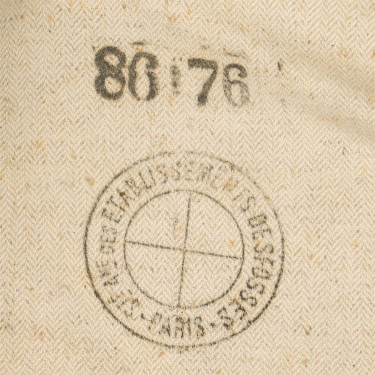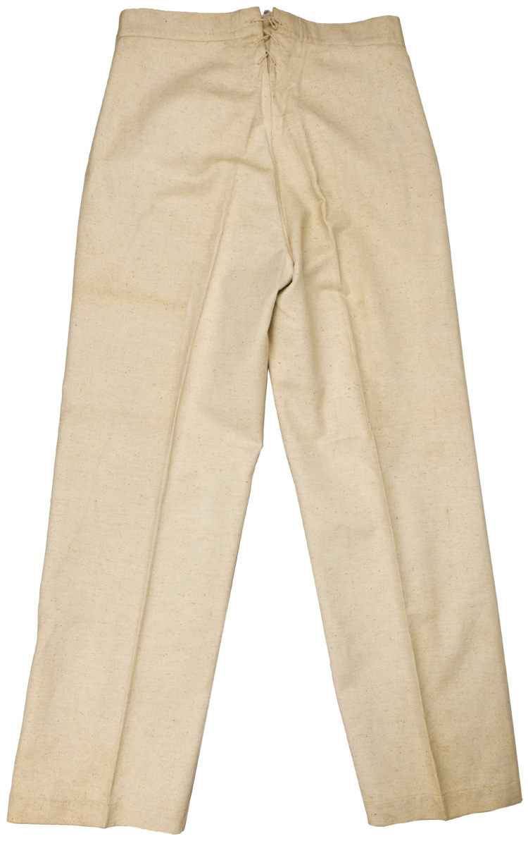 PHYSICAL DESCRIPTION: Standard issue, light weight, cotton/rayon blend construction work/tropical pants with an HBT, (Herring Bone Twill), weave feature the unique, naval style, front closure in the form of a horizontally rectangular, fold down, front yoke panel with four, stitched, button eyelets to the top edge with corresponding buttons on the waistband. All original buttons. The pants are roughly size 30" waist. French production for the Kriegsmarine.