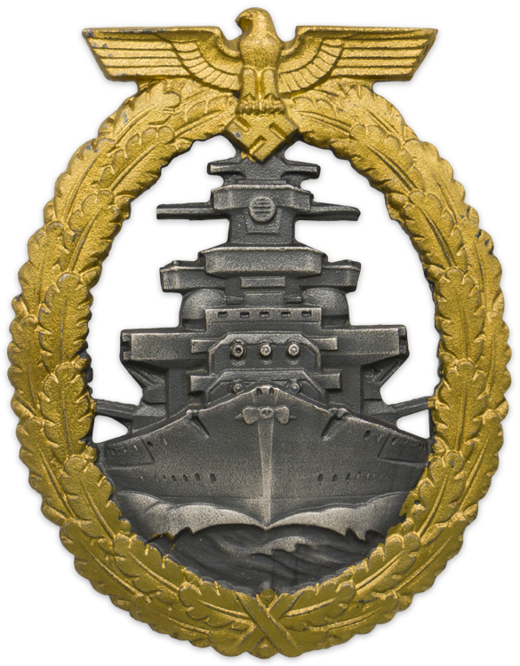 BACKGROUND: The High Seas Fleet War Badge was instituted by Oberbefehlshaber der Kriegsmarine und Großadmiral, (Commander in Chief of the Navy and Grand Admiral), Erich Raeder on April 30TH 1941 to recognize the actions of personnel serving on German battleships and cruisers in the battle against England. Bestowal criteria varied with the main qualification being twelve weeks of active service on a battleship or cruiser.
