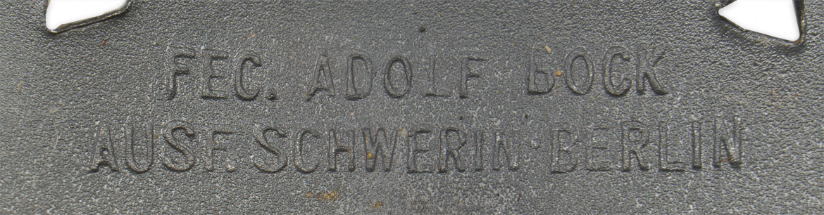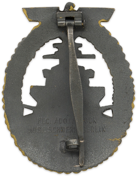 PHYSICAL DESCRIPTION: Die struck, solid backed, nicely convexed, alloy construction badge with gilt and burnished silver finishes. The badge features a vertically oval oak-leaf wreath with a national eagle with out-stretched wings superimposed to the top center, encompassing a nicely detailed, cut-out, "face on", likeness of the battleship Bismarck cutting through waves. The solid reverse of the badge is slightly concaved. The reverse has a solid, soldered hinge, a broad vertical pin and a heavy soldered catch all intact. The reverse is well marked with the embossed designer and manufacturers names, "Fec. Adolf Bock", and "Ausf. Schwerin-Berlin", respectively. Super nice!