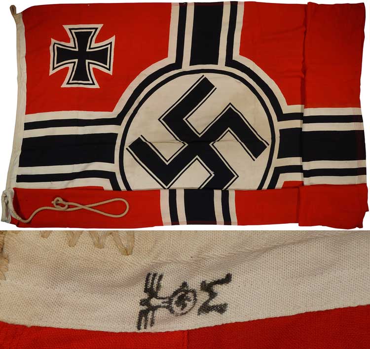 PHYSICAL DESCRIPTION: Second pattern, (circa 1937-38), single piece, dual sided, printed flag features a red base field with a central white/black/white/black bordered white disk with a black and white bordered black canted swastika to the center. The flag has black vertical and horizontal bars emanating from the central disk with white/black/white borders. The canton features a white/black/white bordered black Iron Cross. The top and bottom edges of the flag have six rows of reinforcement stitching and the fly edge also has six rows of reinforcement stitching with a dual-ply hem. The hoist edge has a small dual-ply, rectangular reinforcement panel to each corner. The hoist edge is trimmed in white, tunnel looped, cotton bunting for the suspension rope. The suspension rope is still intact and is looped at the top edge. The bunting is well marked with black inkstamped, "Eagle over M", indicating Kriegsmarine usage. Size is roughly "150cm x 250cm". A few small hole and shows period use, but overall nice example.