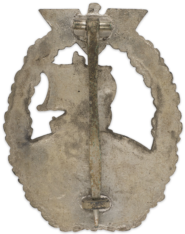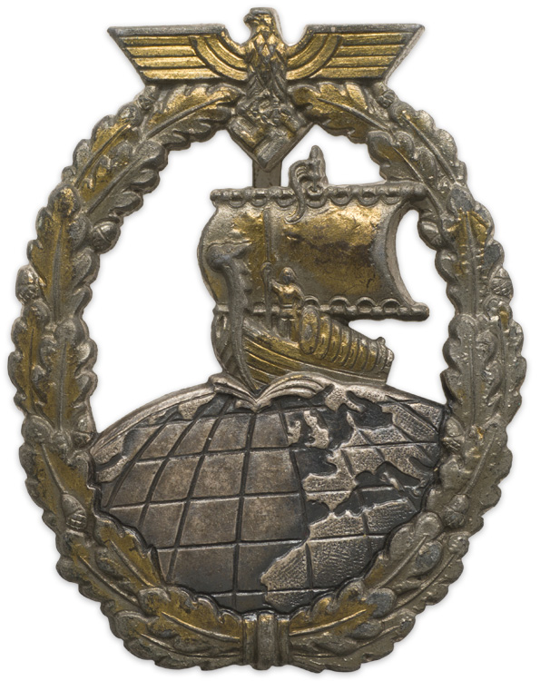 PHYSICAL DESCRIPTION: One piece, die struck, alloy construction badge with gilt and silver plated finishes. The badge is in the form a gilt washed, vertically oval, embossed, oak-leaf wreath with a national eagle with out-stretched wings, clutching a canted, swastika in it’s talons, superimposed to the top center, encompassing a cut-out, "Viking" style, long boat with full sail, cruising on a separate likeness of a northern portion of the globe. The detailing includes the dragon figurehead and oval shields on the ship, longitude and latitude lines and the embossed outline of Great Britain, Western Europe and North Africa on the globe. Complete pin and catch assembly. Unmarked Foerster & Barth production.