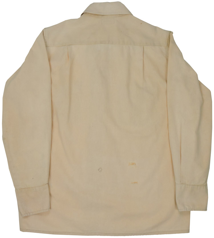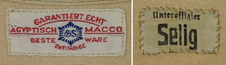 1920's or early 1930's German private purchase tan cotton tropical shirt for the Reichsmarine (I think). German cotton rectangular makers label in the collar states it is guaranteed Egyptian cotton. Long sleeve shirt with two pockets, green buttons, and small green Reichsmarine (or maybe older Kaiserliche Marine) buttons and cotton loops for shoulder straps (that had narrow tongues) on the shoulders. This shirt is extremely heavily sun-faded; it was once a mustard color like that used in issue colonial uniforms (i.e., Kolonial Amt issued) for colonial troops (Schutztruppe). The only hint of the original mustard color now is down inside the pockets (photo). Possibly even pre-WW1 vintage officer's private purchase. An unusual shirt in that it buttons down the front the whole way while, except dress shirts for formal events, most German shirts of this period only buttoned half way down the front. Chest size 36".