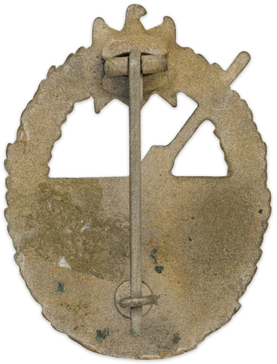 PHYSICAL DESCRIPTION: Die struck, alloy construction badge is in the form of a gilt washed, vertically oval, oak-leaf wreath with a national eagle with down-swept wings, clutching a canted swastika in it’s talons, superimposed to the top center, encompassing the frosty silver washed, cut-out likeness of an 88mm coastal artillery gun with the barrel of the gun extending beyond the edge of the wreath. Complete with original hinge, pin and catch assembly.