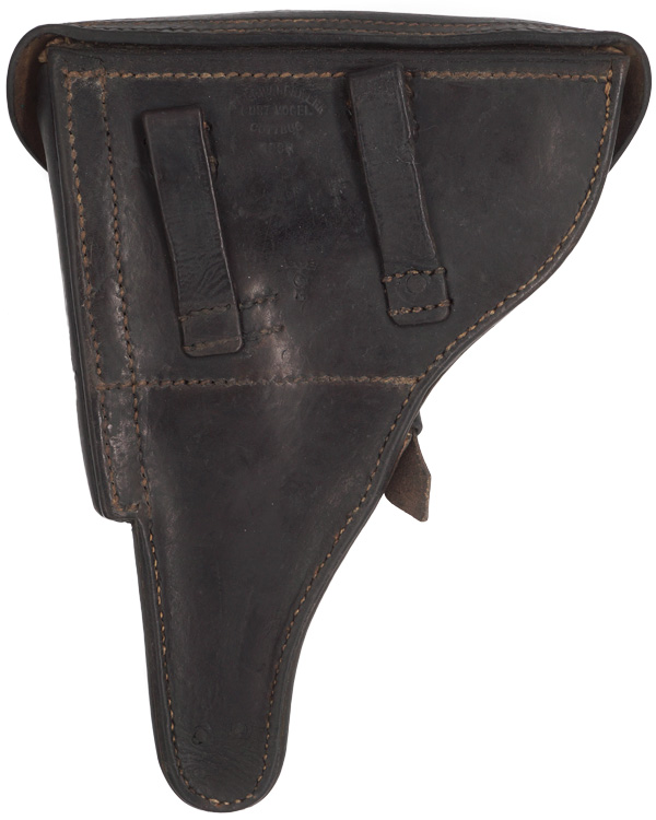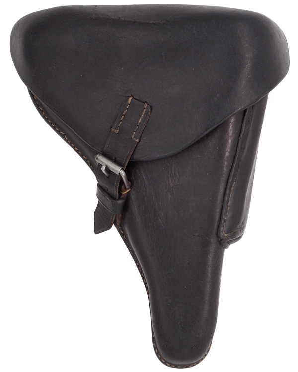 PHYSICAL DESCRIPTION: Roughly, 26cm tall, 20cm wide at the top, tapering down to 35mm at the bottom, early, smooth, molded leather construction hard-shell holster for the standard 4" barrel P08 Luger pistol. The holster features a scalloped, fold back, top flap with a horizontal stitched seam/hinge to the reverse and a slightly diagonally angled, stitched on, closure strap to the obverse. The closure strap attaches to a leather reinforced, magnetic, pronged, roller buckle which is stitched to the front of the holster body. The holster has a vertical, extra magazine pocket stitched to the forward edge with a semi-circular cut-out to the top edge for ease of accessing the extra magazine. The standard internal, quick release, pull strap, inserted through a small, horizontal, slash on the front body. The reverse of the holster has dual, slightly diagonally angled, belt loops stitched in place. The interior of the top flap has a small, leather pocket with a steel stud closure for the quick loading tool. Maker marked & dated for 1938. Waffen-amt marked. Nicely marked Eagle over "M", indicating Kriegsmarine issue. Nice!