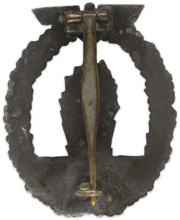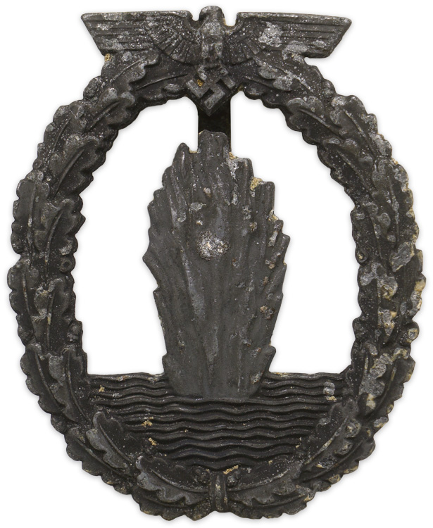 PHYSICAL DESCRIPTION: Solid backed, zinc construction badge. The badge is in the form of a vertically oval, oak-leaf wreath with a national eagle, with outstretched wings, clutching a canted swastika superimposed to the top center, encompassing horizontal waves and a cut-out, vertical, exploding, water funnel. Unmarked. Complete pin and catch assembly.