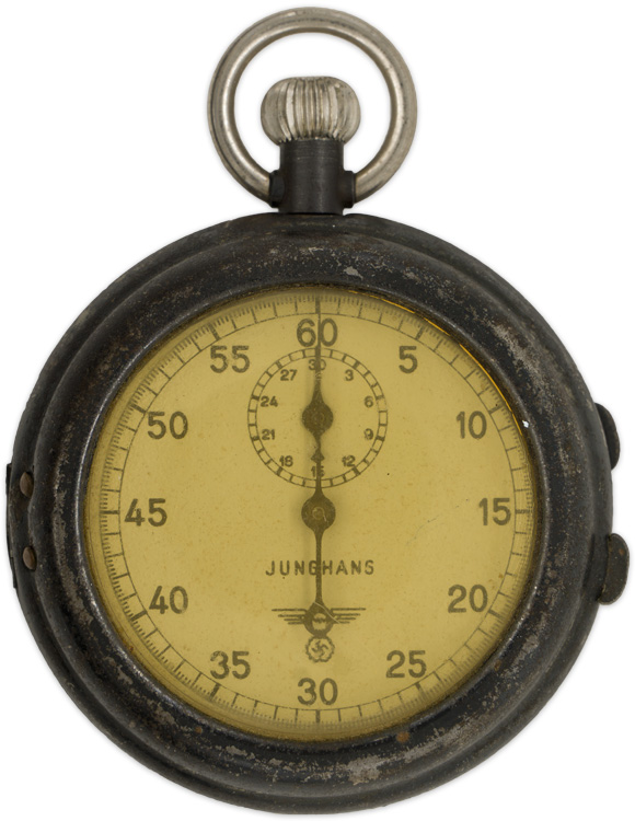PHYSICAL DESCRIPTION: Nice quality, tooled metal alloy construction pocket stop watch with a nickel/silver plated finished housing and an inset, clear glass, face plate. The exterior top edge of the watch has a vertically extended winding/setting dial that still functions and a circular, swivel, suspension loop. Maker marked to "Junghans". The watch still functions. Getting hard to find.