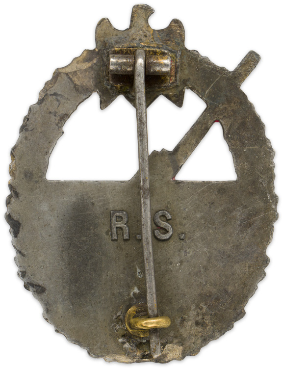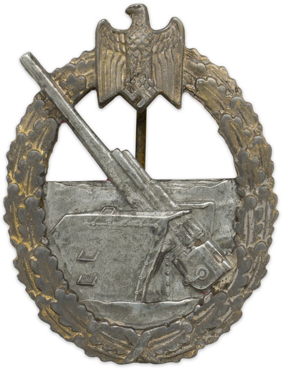 PHYSICAL DESCRIPTION: The die struck, solid backed, alloy construction award with gilt and burnished silver finishes is in the form of a vertically oval, oak-leaf wreath with a Wehrmacht pattern national eagle with down swept wings, superimposed to the top center, encompassing the cut-out likeness of an 88mm coastal artillery gun with the barrel of the gun extending beyond the edge of the wreath. The solid reverse has a crimped, soldered hinge inset into a rectangular recess with raised securing lips, a thin round vertical pin and a soldered catch inset into an oval depression all intact. The reverse of the badge is well marked with the embossed manufacturers initials, "R.S.", indicating manufacture by Rudolf Souval of Wien.