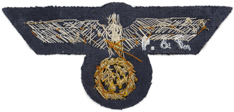 PHYSICAL DESCRIPTION: Nice quality, hand embroidered visor cap eagle with out stretched wings, clutching a wreathed, canted, swastika in it’s talons, in heavy gilt wire threads with black cotton accent threads, on a cut out, navy blue, wool base.