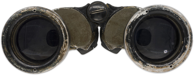 PHYSICAL DESCRIPTION: Cast alloy construction binocular bodies with brass fittings and water-proofing protective rubber seals to ocular ends. Field-grey paint which is retained about 75%. Rubber seals to ocular ends have separate raised eye sockets with small alloy retaining clips. Rubber seals to both ends show edge cracking but are fully intact. Optics are crisp and clean. Right hand side ocular end well marked with stamped designation, "7x50", (7 power magnification with a 50mm diameter objective lens), serial number, "38531", and manufacturers code, "blc", for Carl Zeiss Jena. Scarce U-Boat crew type.