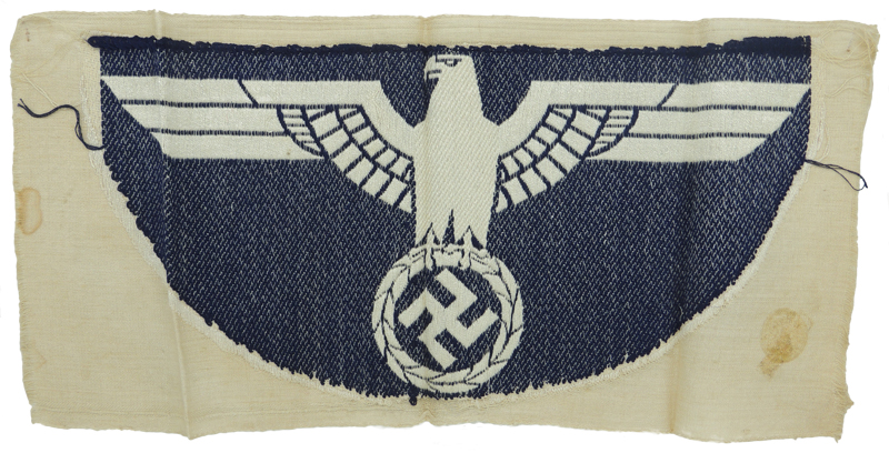 PHYSICAL DESCRIPTION: Cornflower blue, machine woven, national eagle, with out-stretched wings, clutching a wreathed, canted, swastika in it’s talons, to the center.